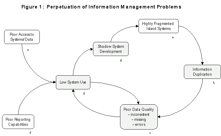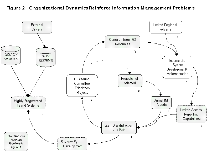 Information management needs that are not met (whether due to projects not being funded or due to selected projects not being adequately implemented) leave staff feeling dissatisfied with agency information management capabilities (h) and still suffering from lack of information management support. This in turn drives staff to develop "shadow" systems (I) that contain some, all, or none of the data maintained in other "official" systems designed by the agency, further compounding the agency's fragmentation problem (j).